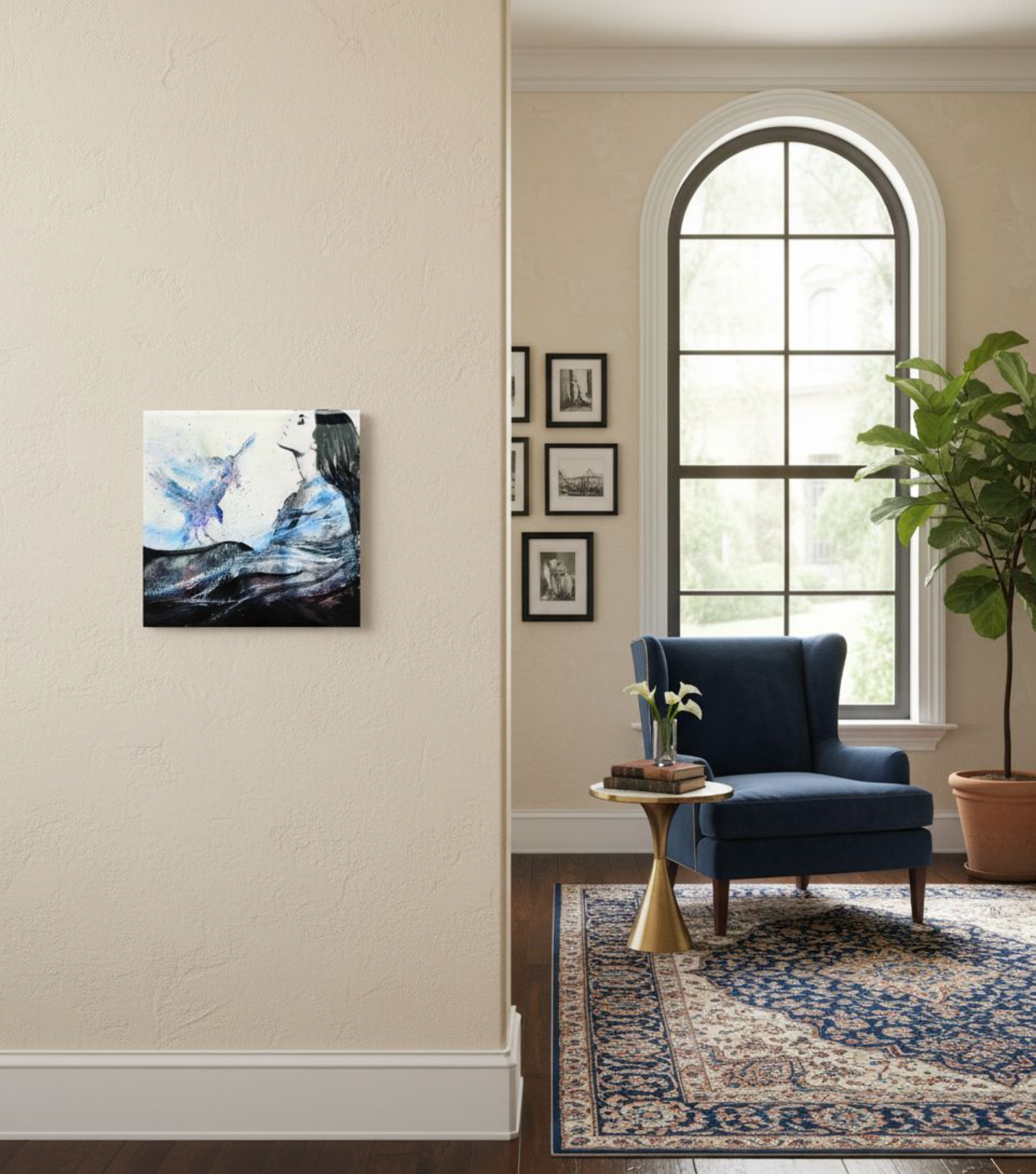 In Sovereign, I painted a young woman sitting quietly among the waves, surrounded by two eagles. The waves, to me, represents emotion and intuition — always moving, always alive. The eagles embody wisdom and strength, guiding her as she finds calm within her own power. This piece is about the balance I often seek myself — staying grounded and graceful, even when life feels vast and unpredictable.